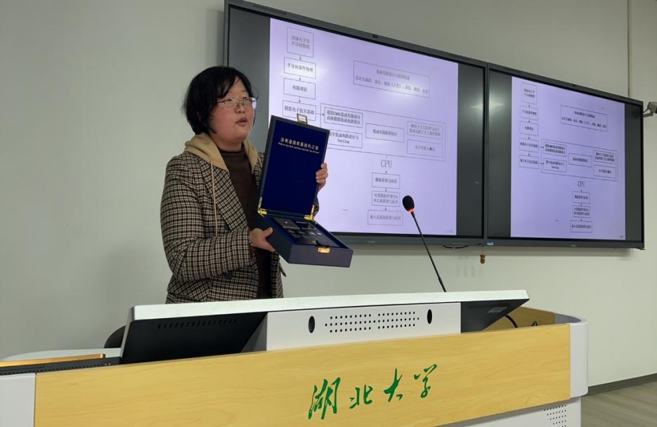 活动中,潘玉茜副主任展示了刘校长赠予微电子学院的华为鲲鹏芯片,并寄语学生以成为集成电路领域领军人才为志向,精进专业知识,强化实践能力。该芯片寓意深远,旨在激发学生的科技报国热情,鼓励他们投身国家集成电路产业建设。