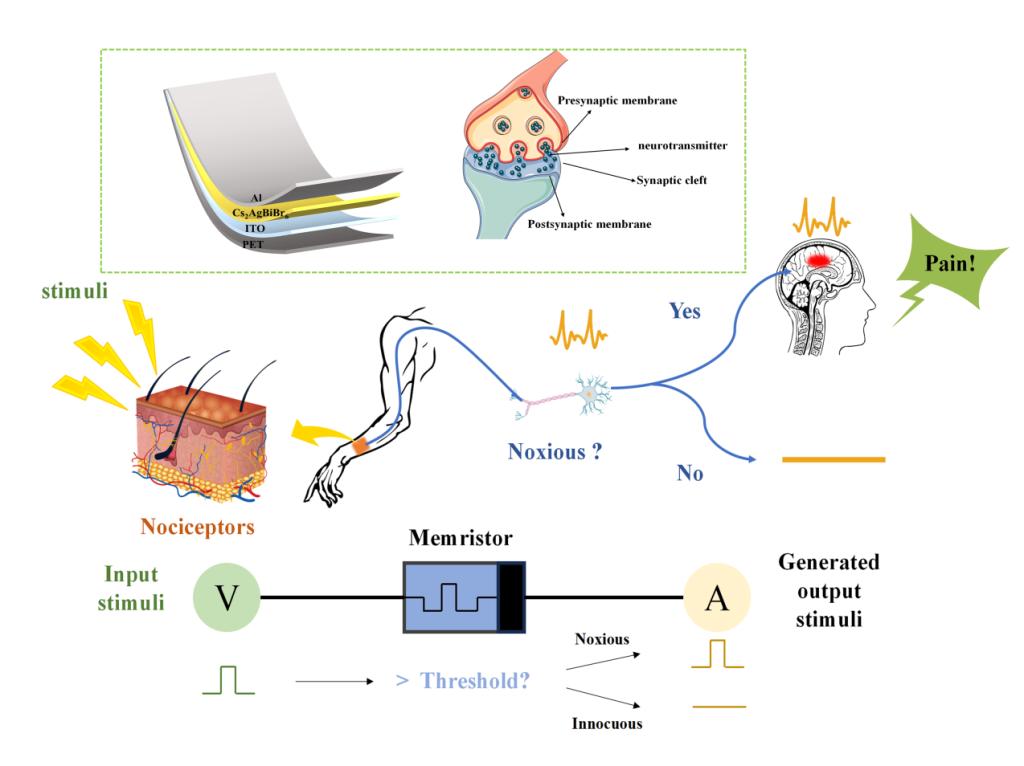鉴于此,该团队制备了低温下稳定的无铅钙钛矿 Cs2AgBiBr6柔性忆阻器,实现了优异的阻变性能和长期环境稳定。采用该忆阻器模拟了人工突触行为,包含长时增强/抑制性, 双脉冲促进和脉冲时间依赖的突触可塑性。通过调节脉冲信号,利用该器件模拟了人工痛觉感受器的主要特征,如“阈值”、“无适应”和“放松”;还模拟了伤后的“痛觉过敏”和“异常性疼痛”特征,这些特征对疼痛感知至关重要。此外,通过该忆阻器中导电细丝的随机性生成一系列随机数,探索了其在图像加密和信息安全方面的应用。这些研究为未来柔性智能电子器件的开发提供了新的思路。
