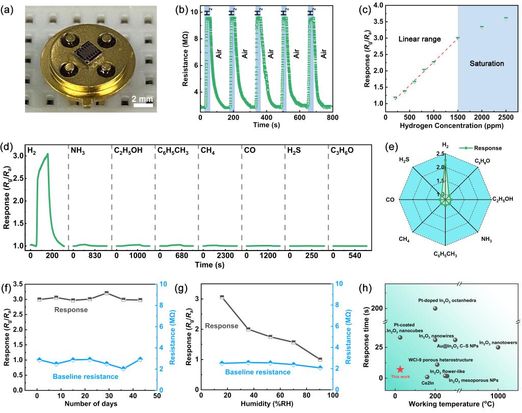 氢气兼具清洁能源载体、化工原料和冷却剂的多重属性,广泛应用于能源、交通、建筑、冶金、化工、半导体和航空航天等领域。但氢气具有极宽的爆炸极限(4%-75%)和极低的点火能量(0.02 mJ),在生产、使用、运输和、储存和加注过程存在较高的安全隐患。因此,开发快速灵敏、稳定可靠的高性能氢气传感器,是氢能及相关产业发展的关键需求。半导体氢气传感器具有灵敏度高、性能稳定、使用寿命长且成本低廉等优势,但传统半导体氢敏材料普遍需要在200 °C以上高温工作,不仅增加了系统复杂度和能耗,还存在选择性差、易中毒失效等关键问题。开发可在室温下快速、高灵敏检测ppm级氢气泄漏的高性能半导体氢气传感器,始终是该领域亟待突破的技术瓶颈。