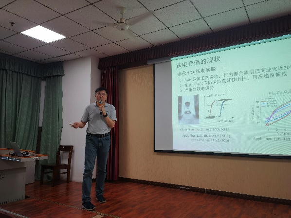 吴迪教授从掺杂HfO2铁电薄膜的结构设计和第一性原理计算角度,提出薄膜中不均匀应变弛豫导致的挠曲电电场会引起正交晶格的菱方畸变,掺杂HfO2薄膜的疲劳来源于亚稳铁电相向热力学稳定的顺电单斜相的转变,菱方畸变后的亚稳结构更加稳定,薄膜具有更好的抗疲劳性能。该思路对优化薄膜的结构和性能有重要的意义。吴迪教授的报告深入浅出、对问题把握准确,分析透彻。在交流互动环节,现场师生踊跃提问,吴迪教授都耐心细致地一一解答。
