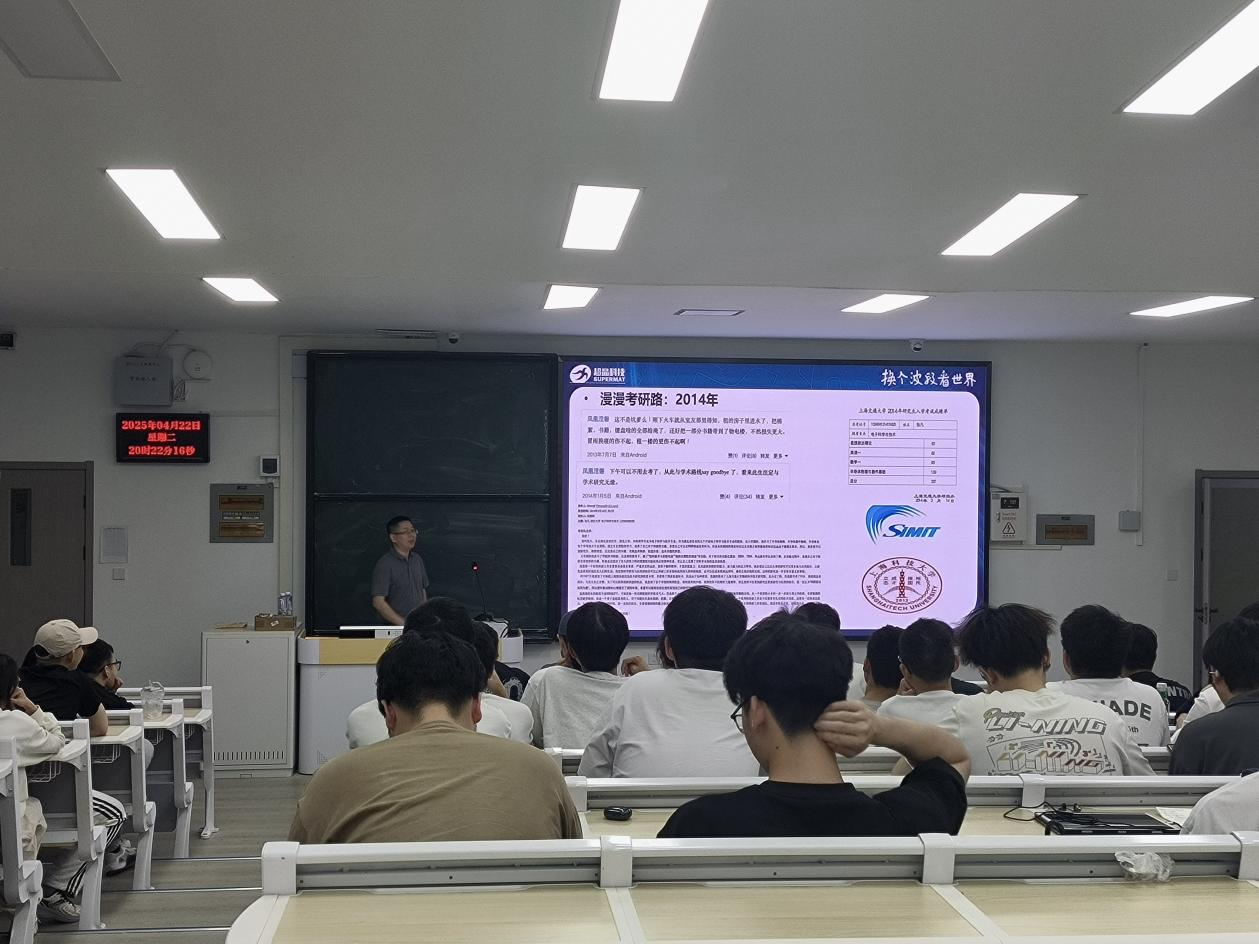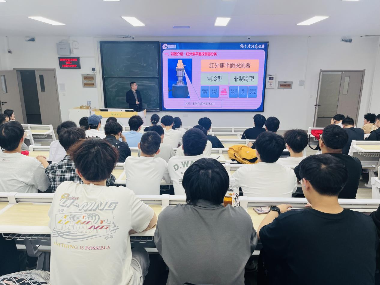 报告伊始,张凡博士立足国家战略需求,系统梳理了超晶格红外焦平面探测器在军事、工业、航空航天以及医疗等关键领域的广泛应用,并详细阐述了当前该领域面临的技术瓶颈。他从半导体器件物理和微电子工艺的角度出发,深入剖析了超晶格红外焦平面探测器的工作原理以及科研产业界的前沿动态,使复杂的理论知识变得通俗易懂,让在场师生受益匪浅。在分享个人经历时,张凡博士介绍了其在宁波超晶光电科技有限公司组建国内首个新型化合物半导体红外焦平面探测器批量生产研发团队的历程。他带领团队成功实现了基于二类超晶格技术的红外焦平面探测器产品的定型和批量生产,为我国在该领域的技术突破做出了重要贡献。张凡博士还强调:“超晶格红外焦平面探测器让我们换个波段看世界,其发展直接关系到国家安全和民生福祉。”他指出,当前光电探测产业链仍存在诸多“卡脖子”技术问题,而行业对电科、光电、微电子和集成电路人才的需求正急剧增加。他鼓励在场学生珍惜在校时光,学好每一门基础课和专业课,并以自身经历为例,阐述了扎实的专业知识在实际工作中所发挥的关键作用:“等你们毕业后从事生产研发工作,就会深刻体会到当年为什么要学习量子力学、固体物理学和半导体物理等课程。”